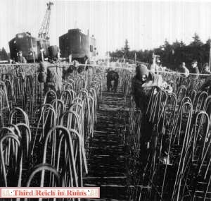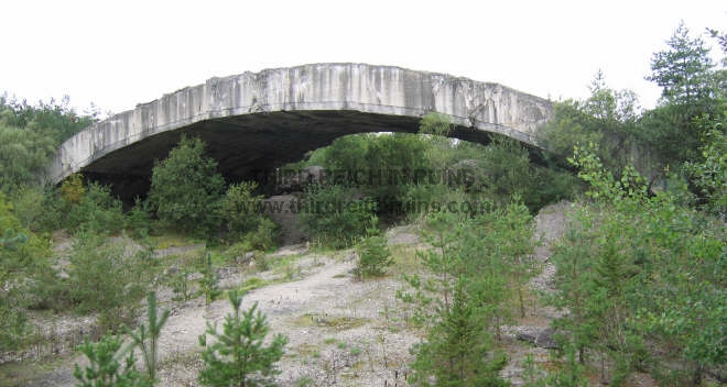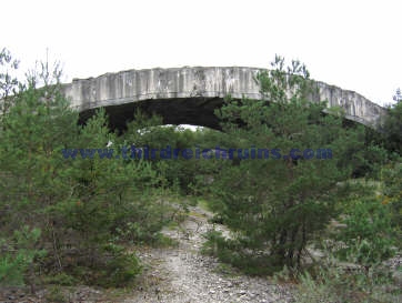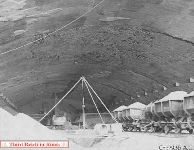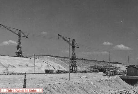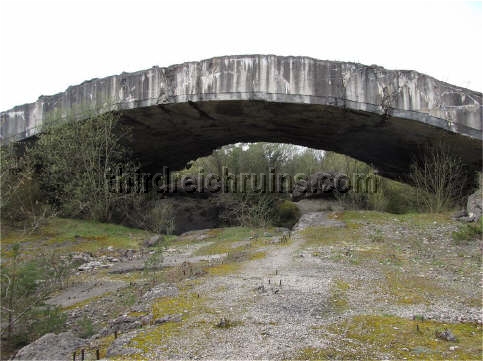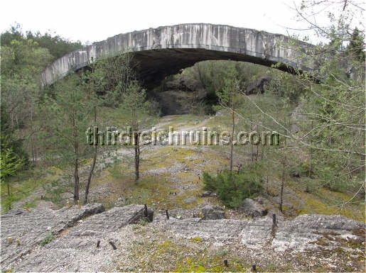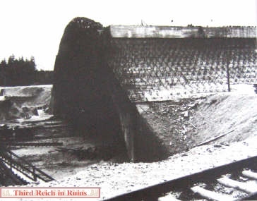 Several underground manufacturing sites were built in the Third Reich in 1944-45, to protect vital industries from the Allied bombing campaign. Most of these sites consisted of underground tunnels, built in existing mines or new excavations (for example, see the Nordhausen, Kahla, and Ebensee pages). But a unique type of bunker was started near Mühldorf am Inn, east of Munich, called Project "Weingut I" (Wine Estate). This site was to consist of a long massive structure built from reinforced poured concrete arches. The subsurface earth would have been excavated from under the structure to provide a large working area. Design and heavy construction work was performed by the engineering firm Polensky & Zöllner, with manual labor by concentration camp inmates and Russian POWs from Dachau and other sites, who were quartered in nearby camps. (Other bunkers of this type were built near Landsberg (Weingut II and Diana II), and planned in the Sudetenland and the Rheinland.) The site was planned for the manufacture of Me 262 jet aircraft engines and parts, and construction began in May 1944, but the site was not completed. Only half of the concrete arches were poured, and the underlying excavation was not finished, when the war ended. Other structures in the area included air raid protection bunkers, cement factories, and administration buildings. The bunker structures were built by piling mounds of gravel on the ground, in the appropriate shape, and pouring concrete onto these to a thickness of three meters. The concrete was poured in separate arch sections. The finished bunker was to have consisted of twelve arches, for a total length of almost 400 meters. The underlying gravel was then excavated out, including a planned depth of 18 meters below the original ground level. An additional two meters of concrete would have been added, then earth would have been placed on top of all and planted, for camouflage. Construction stopped in late April 1945, when the prisoners were force-marched toward Munich (resulting in many deaths), and the U.S. Army overran the site on 2 May 1945. All but one of the seven existing arches were collapsed by explosives in 1947.