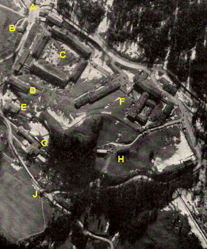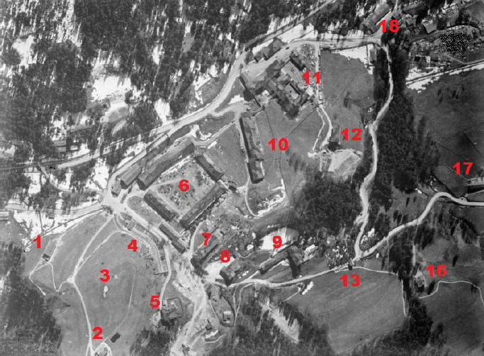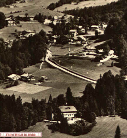 This photo, one of a series of aerial views taken in mid-May 1945 by the U.S. Army Air Forces, shows a similar view to that above (showing more to the right). The ruined Berghof, hit at least twice during the 25 April 1945 bombing by the RAF, and later set on fire by departing SS troops, is at the lower left-center of the photo. Comparing to the photo and map above, you can also see the partly-ruined Hotel Zum Türken and the main SS guard house. Uphill from the Türken is the bombed-out SS barracks complex. Not visible in the photo above, but seen in this one, are the Platterhof hotel (right center), with its Guest House just below. The roof of the garage and employees quarters for the Platterhof can be seen to the left of the Platterhof, adjacent to the SS barracks. This view also shows one of the emergency exits to the air raid shelter system beneath the hill behind the Berghof - a lighter hued area just off the left wingtip of the P-47 Thunderbolt seen in the lower center of the photo. In the left distance can be seen the buildings of the Klaushöhe settlement. (National Archives, RG 342-FH)