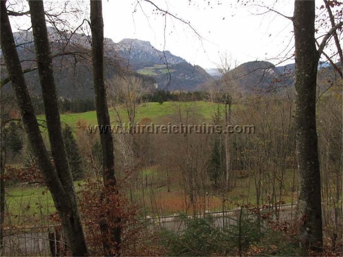 The view at left shows the Berghof as seen from Bormann's house. Note the stepped retaining wall cut into the hill, just to the rear of the house. This retaining wall is all that remains intact today, in the woods that have grown up since 1952 (the modern view is looking back toward the area pinpointed in the previous view, at an exterior angle in the retaining wall, between the Berghof itself and the adjacent Adjutancy). Some small remains of the foundation can also be found, as well as some of the original asphalt of the driveway, a concrete reservoir, and electrical and telephone cable access shafts. (In 1952 and again during the 2001-2003 destruction of the SS Kaserne ruins, rubble was occasionally dumped on the Berghof site. The present ground level across most of the Berghof site is several feet higher than the original ground level.) (MapQuest Map Link)