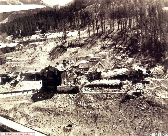 Another in the series of May 1945 aerial views shows the Hotel Zum Türken on the right, with the ruins of the Kindergarten house and the SS barracks uphill behind it. To the left of the SS barracks buildings is the shattered greenhouse, and farther on, at the left edge of this view, are the ruins of Bormann's house. In the lower left-center of the photo is the bombed Unterwurflehen house, where the SS officer who ran the Obersalzberg administrative offices lived. Note how the bombing churned the roads up so that they were barely passable in this area, and note the P-47 Thunderbolt in the center of the photo. (National Archives, RG 342-FH, 3A20805)