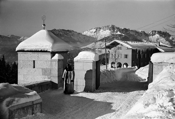 winter view of the back of the gatehouse with the Berghof beyond, and a